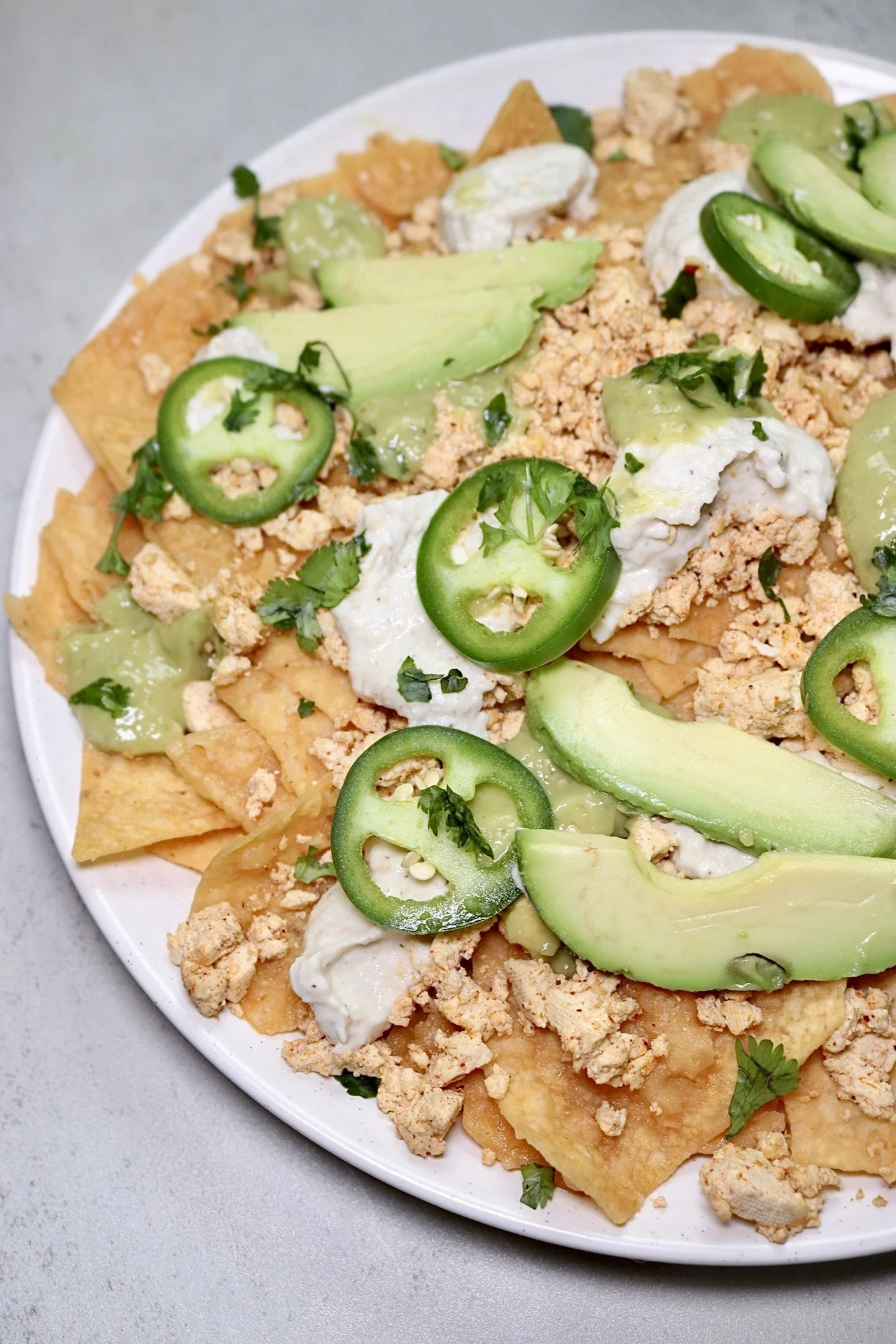 Chilaquiles are one of my favorite breakfast dishes. Anytime I see a vegan version on a menu, I’m ordering it, no hesitation. Traditionally made with eggs, I swapped in chili tofu for a plant-based twist. A zesty cashew crema goes on top, and I finished mine with cilantro, tomatillo salsa, and jalapeño. Dress yours up however you’d like!